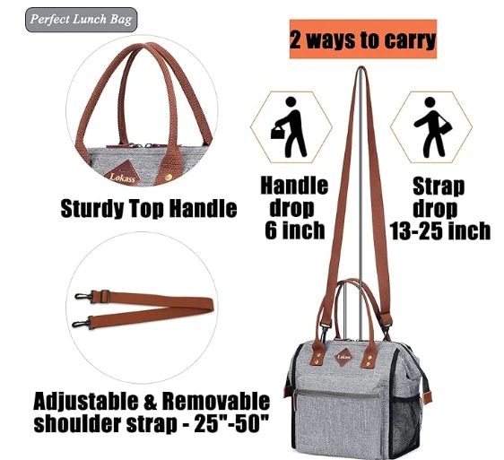 កាបូបអាហារថ្ងៃត្រង់ធំមានបន្ទប់ចម្បង (10.5 "x6" x12 ") ដែលជាហោប៉ៅខាងមុខដ៏ធំមួយ (8" x7 x7 x1.5 "), ហោប៉ៅខាងក្រោយ (9.5" x6 x6.5) និងហោប៉ៅចំហៀង 2 ។ ចំណុចទាញកំពូលនិងលៃតម្រូវបាននិងលៃតម្រូវខ្សែស្មាស្មាដែលអាចដោះចេញបាន (25 "-50") រចនាសម្រាប់ការដឹកទំនិញងាយស្រួល។