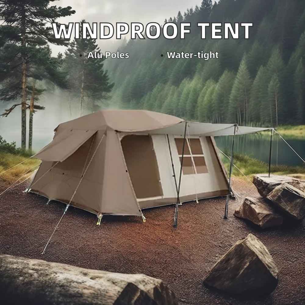 តង់ជំរុំជ្រាបទឹក។ ត្រូវប្រាកដថាក្នុងការជួសជុលភាគហ៊ុននិងខ្សែពួរខ្យល់មួយជំហានម្តង ៗ វានឹងមានស្ថេរភាពជាងតង់លេចចេញស្វ័យប្រវត្តិ។ តង់នៅតែស្ងួតទាំងស្រុងនៅក្នុងថ្ងៃវស្សា។ សមស្របសម្រាប់ការបោះជំរុំក្រៅការឡើងភ្នំការនេសាទក្នុងគ្រប់អាកាសធាតុ។